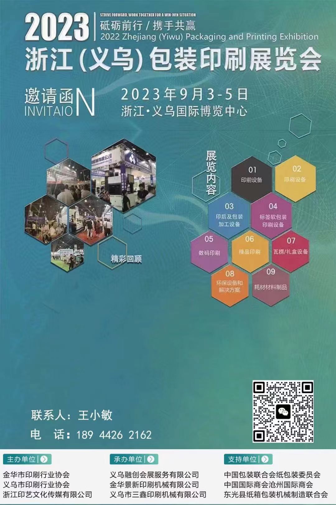 2023浙江(义乌)印刷包装展览会 时间:9月3日-9月5日 地址:浙江·义乌国际博览中心 展示涉及:印刷机械,包装机械,瓦楞纸箱机械,彩盒机械,印刷制品,包装制品,耗材配件全产业链。 咨询热线:王小敏18944262162