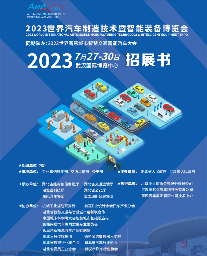 2023世界汽车制造技术暨智能装备博览会 主办单位:湖北省人民政府 武汉市人民政府 东风汽车集团 协办单位:机械工业规划研究院 中国工业设计协会汽车产业分会 湖北省智慧交通与智慧城市创新联合体 承办单位:湖北省经济和信息化厅 湖北省交通运输厅 湖北省科技厅 湖北省公安厅 亚太瑞斯会展集团