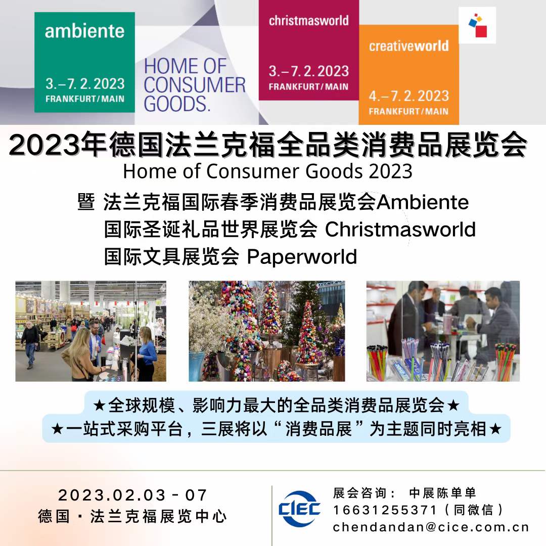 法兰克福展览集团致力为全球消费品产业打造全新平台,积极践行其促进经济发展的使命。集团安排旗下三大消费品展,分别是法兰克福国际春季消费品展览会(Ambiente)、法兰克福国际圣诞礼品世界展览会(Christmasworld)以及法兰克福DIY手工制作及创意文具展(Creativeworld),于2023年2月3/4至7日次同期在法兰克福展览中心举办。借助“消费品展”三展联办的优势,展会将积极发挥参展商、观众及媒体的协同增效作用,并为行业提供独具特色及的产品类别及解决方案。这三场展会的“全球采购板块”将合并且联合进行国际 ”将合并且联合进行国际 化宣传。与此同时,全新的“设计与生活方式”地区宣传平台将在2023 年下半年于法兰克福举行以满足地方性需求。